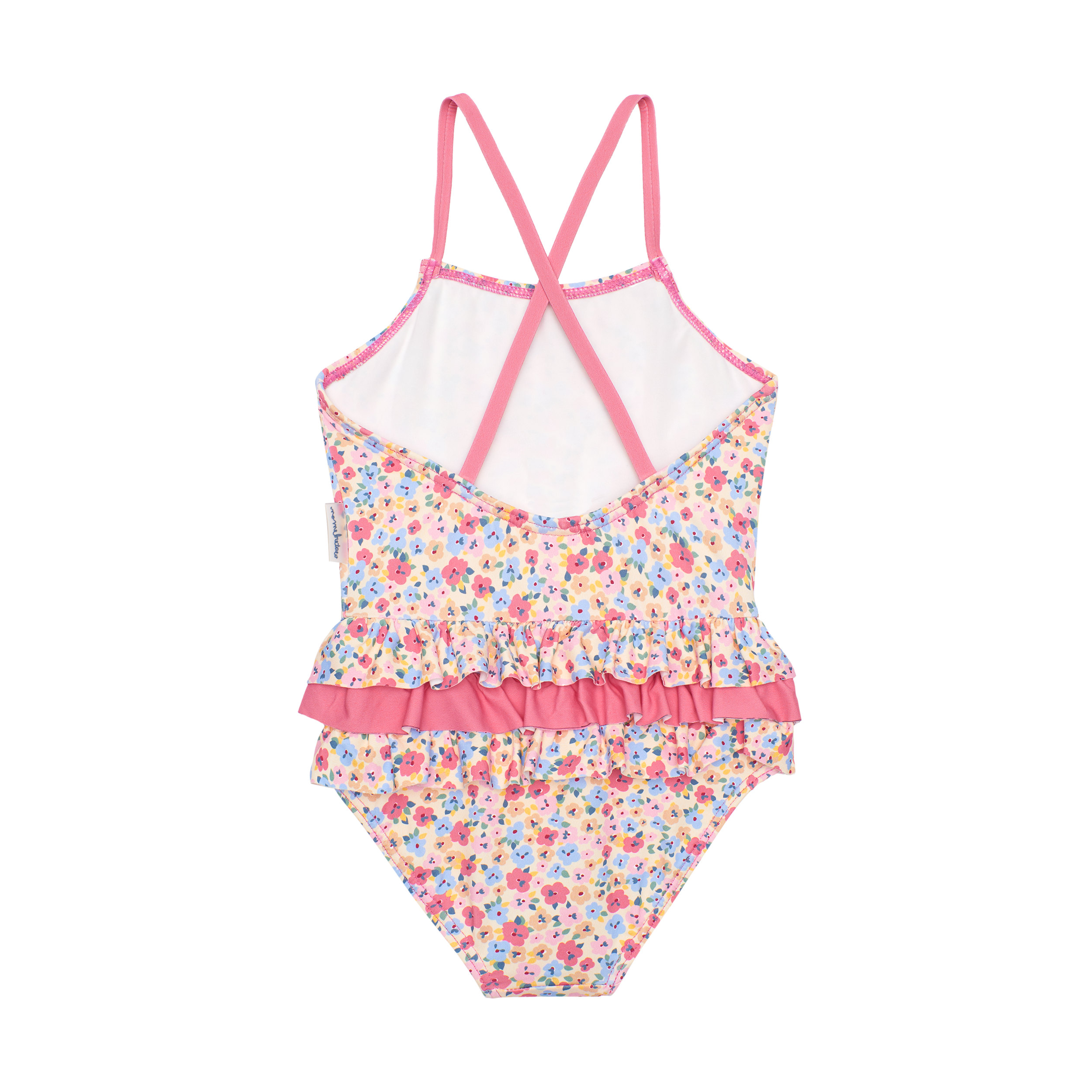 BAÑADOR ESCOTE RECTO, TIRANTES FINOS CRUZADOS EN LA ESPALDA Y TRES VOLANTES EN LA CINTURA.