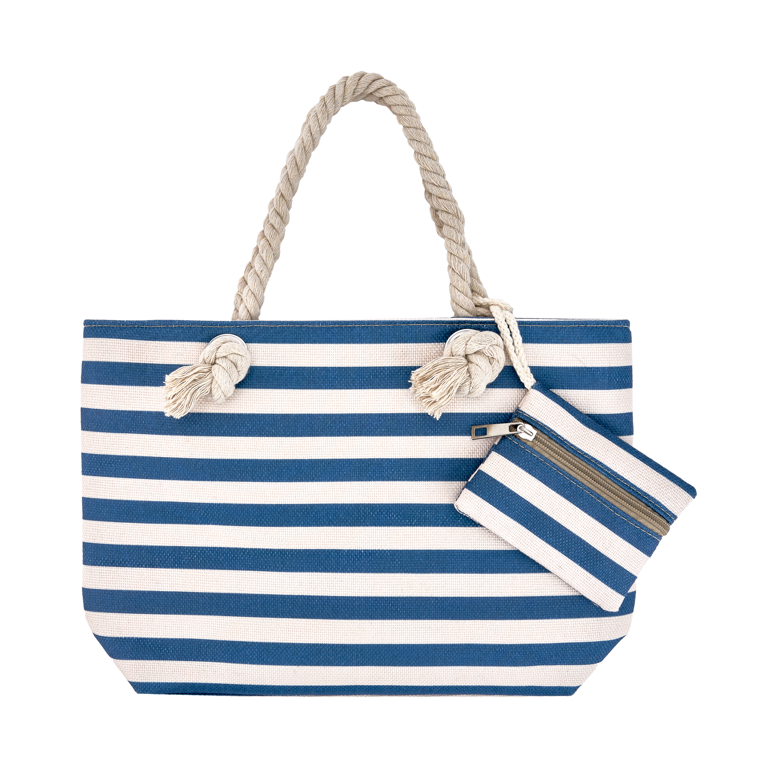 BOLSO FORMATO MINI CON EL INTERIOR FORRADO. MONEDERO INTEGRADO EN EL ASA DE HOMBRO Y CIERRE MEDIANTE CREMALLERA. ESTAMPADO DE RAYAS AZUL MARINO CON FONDO COLOR CRUDO.