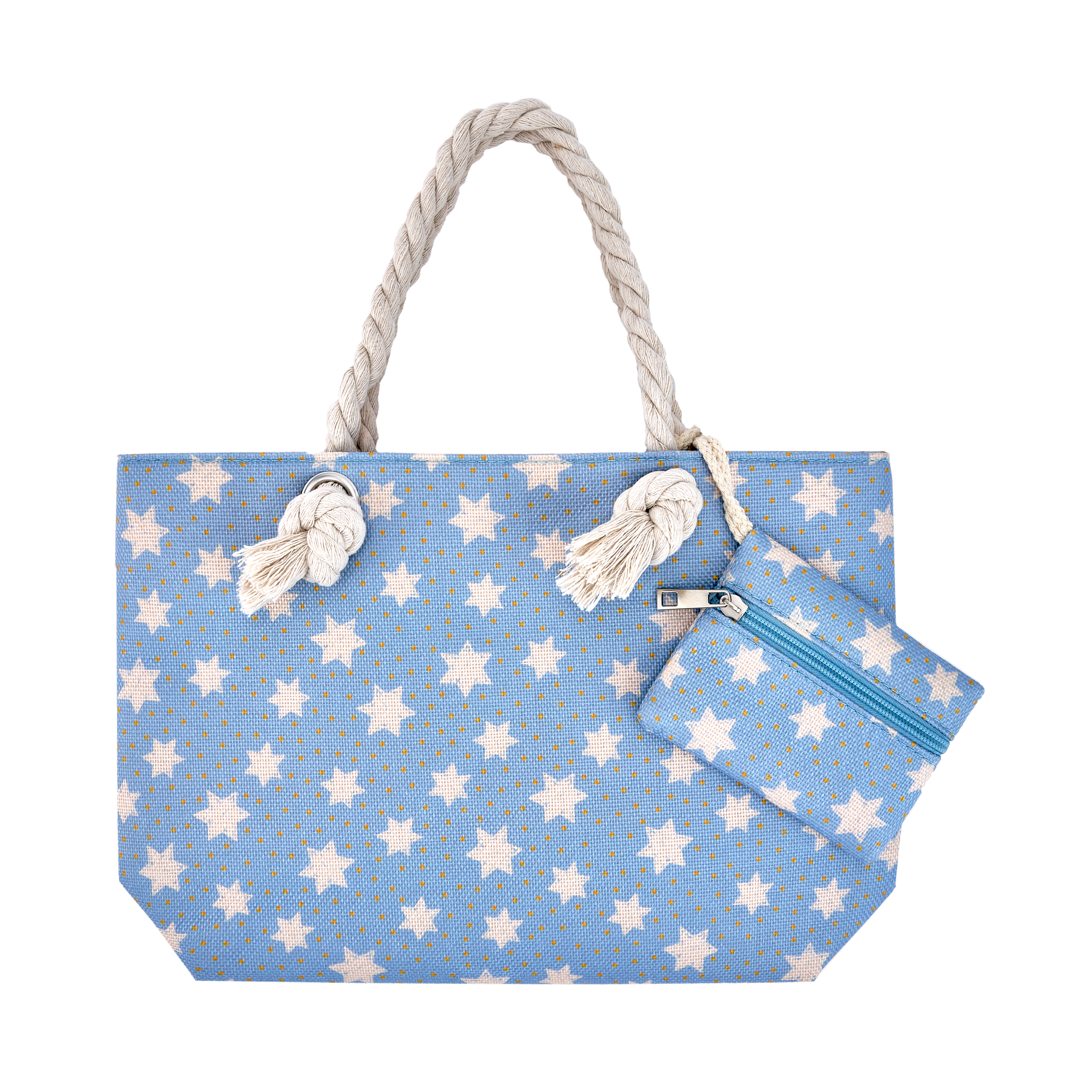 BOLSO FORMATO MINI CON EL INTERIOR FORRADO. MONEDERO INTEGRADO EN EL ASA DE HOMBRO Y CIERRE MEDIANTE CREMALLERA. ESTAMPADO DE ESTRELLAS CON FONDO COLOR AZUL CLARO.