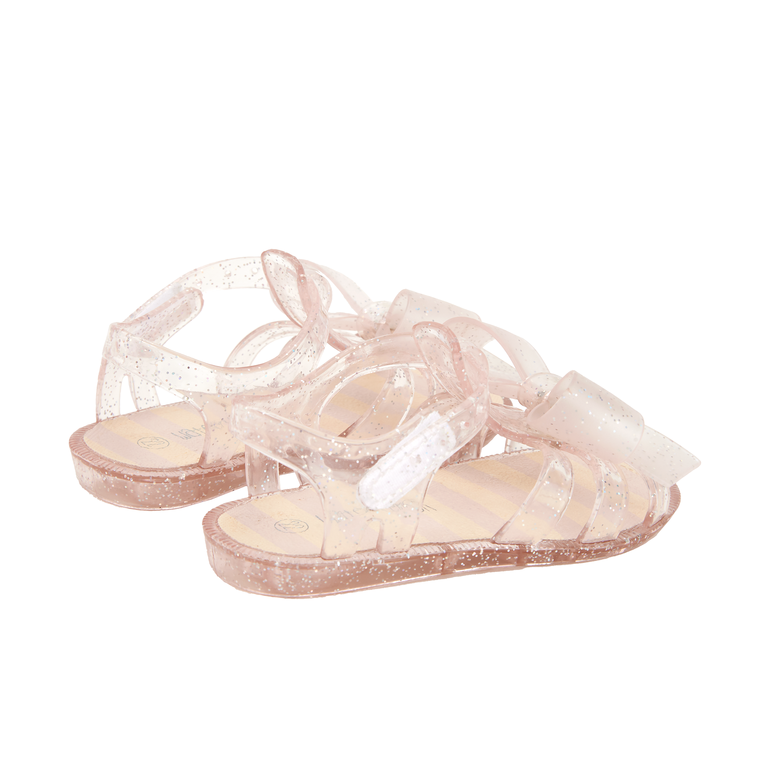 SANDALIA DE BAÑO CON GLITTER, DETALLE DE LAZO EN EL CENTRO Y CIERRE MEDIANTE VELCRO EN EL LATERAL. OLOR A LECHE CON GALLETAS. MATERIAL DE FÁCIL LIMPIEZA.