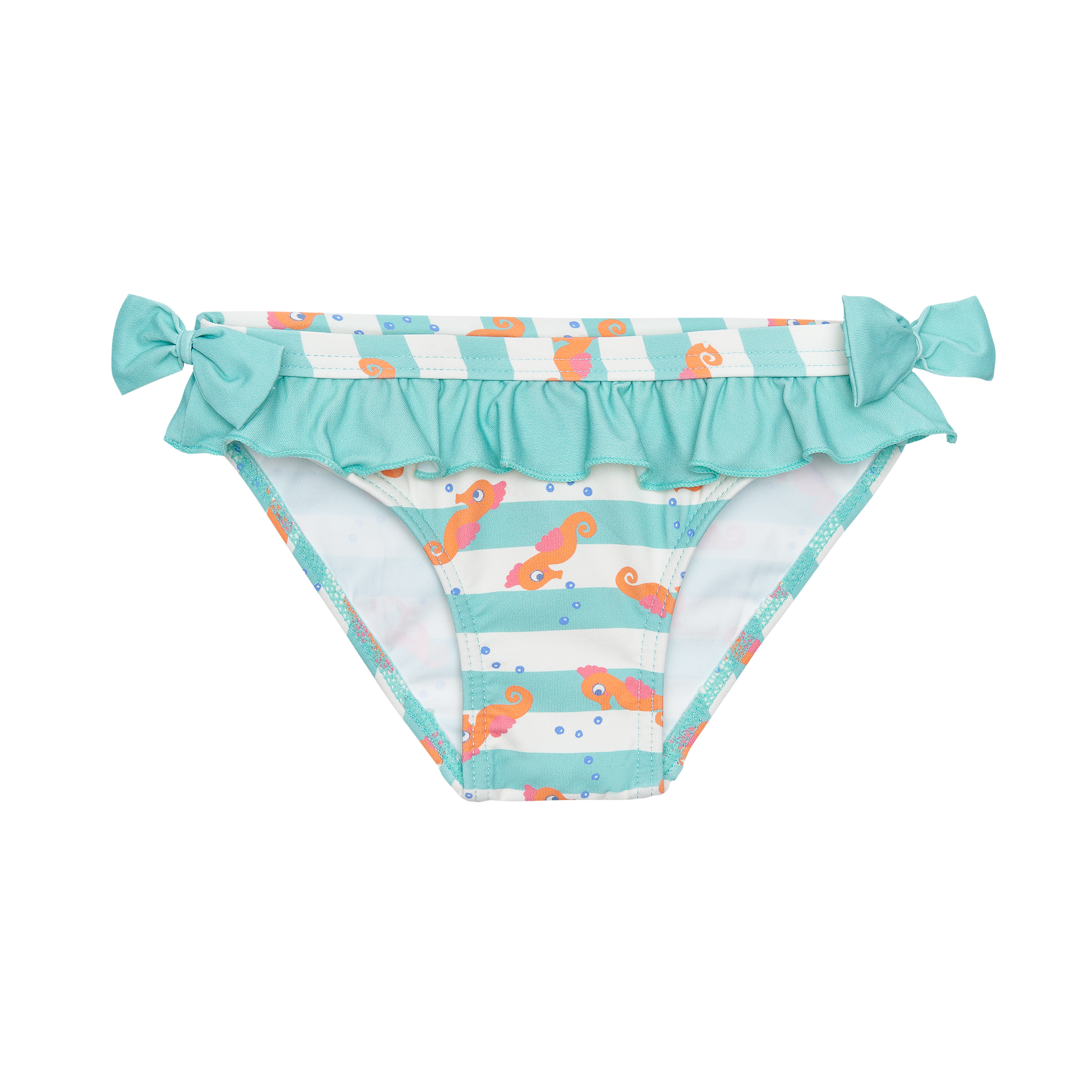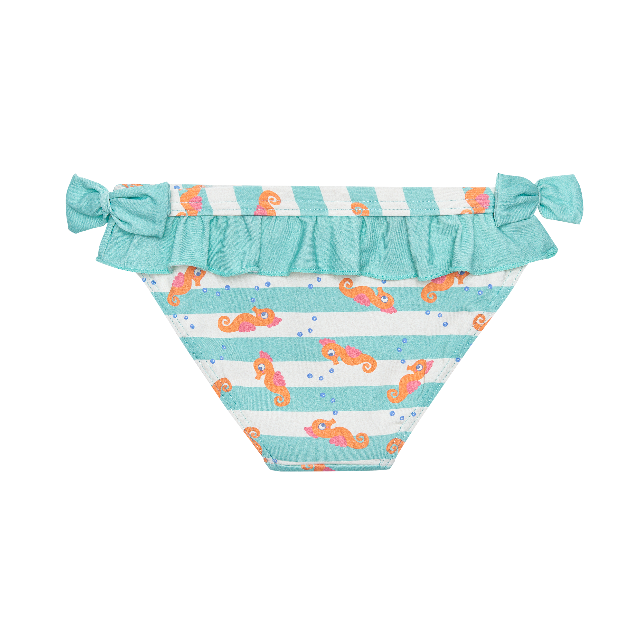 BRAGUITA DE BAÑO CON CINTURILLA ELÁSTICA, VOLANTE Y LAZOS EN LOS LATERALES.