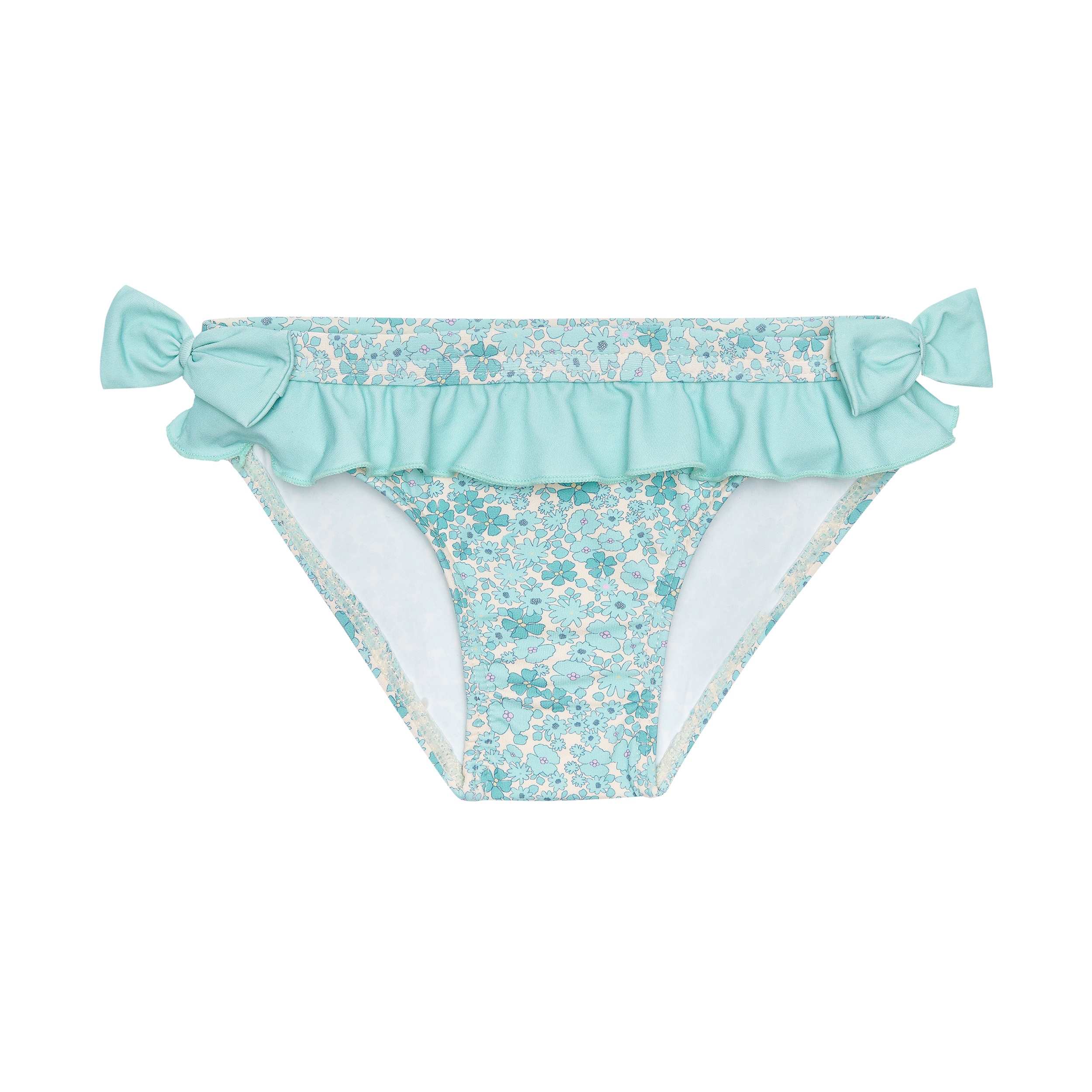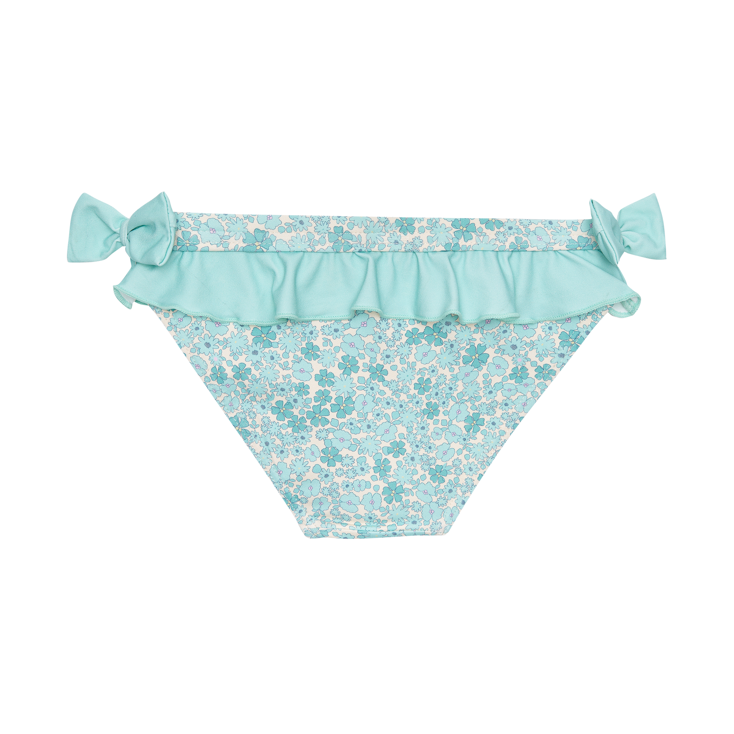 BRAGUITA DE BAÑO CON CINTURILLA ELÁSTICA, VOLANTE Y LAZOS EN LOS LATERALES.
