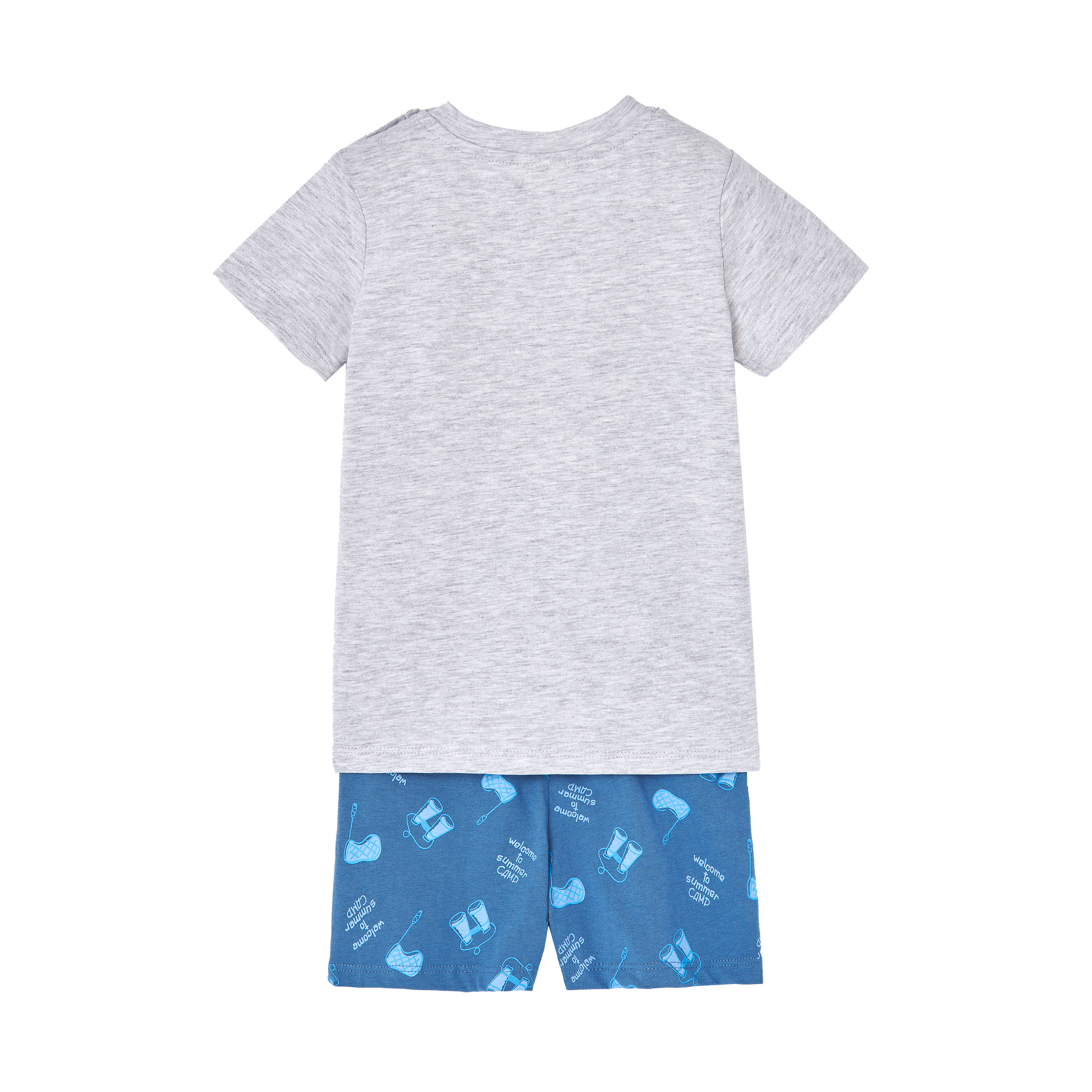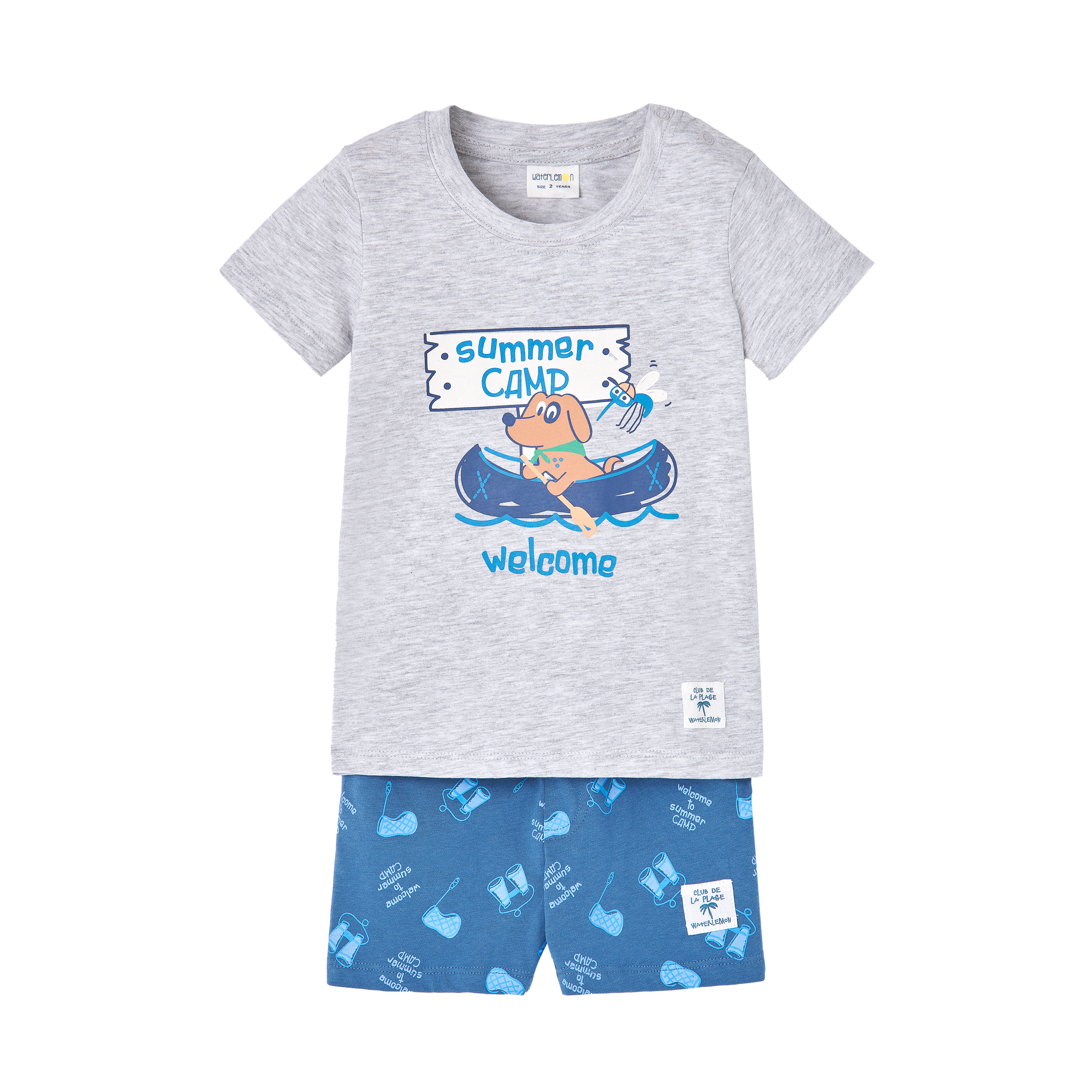 PIJAMA DOS PIEZAS. CAMISETA ESCOTE REDONDO Y MANGA CORTA. BOTONADURA EN EL HOMBRO EN TALLAS 2 Y 3. ESTAMPADO POSICIONAL DE UN PERRO.