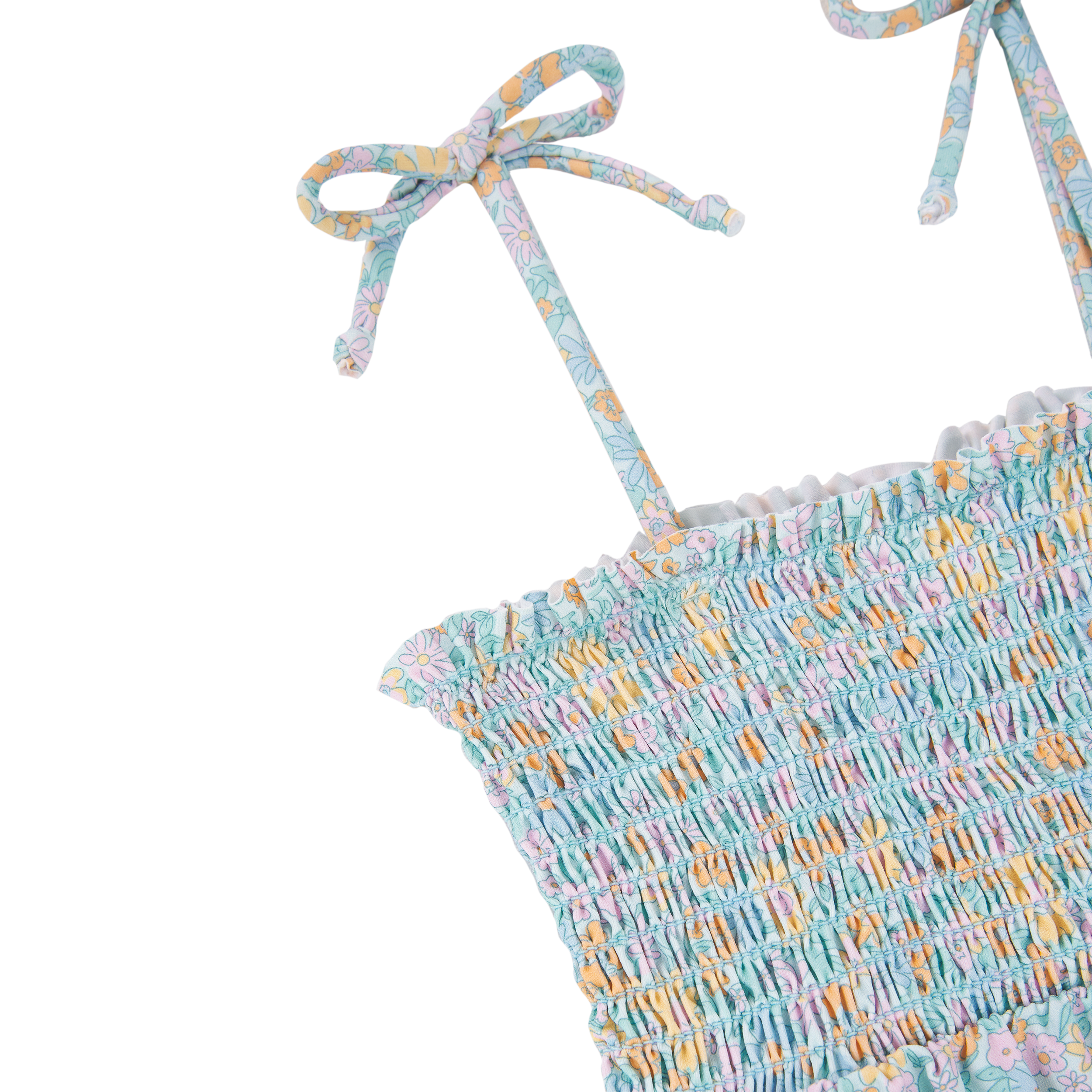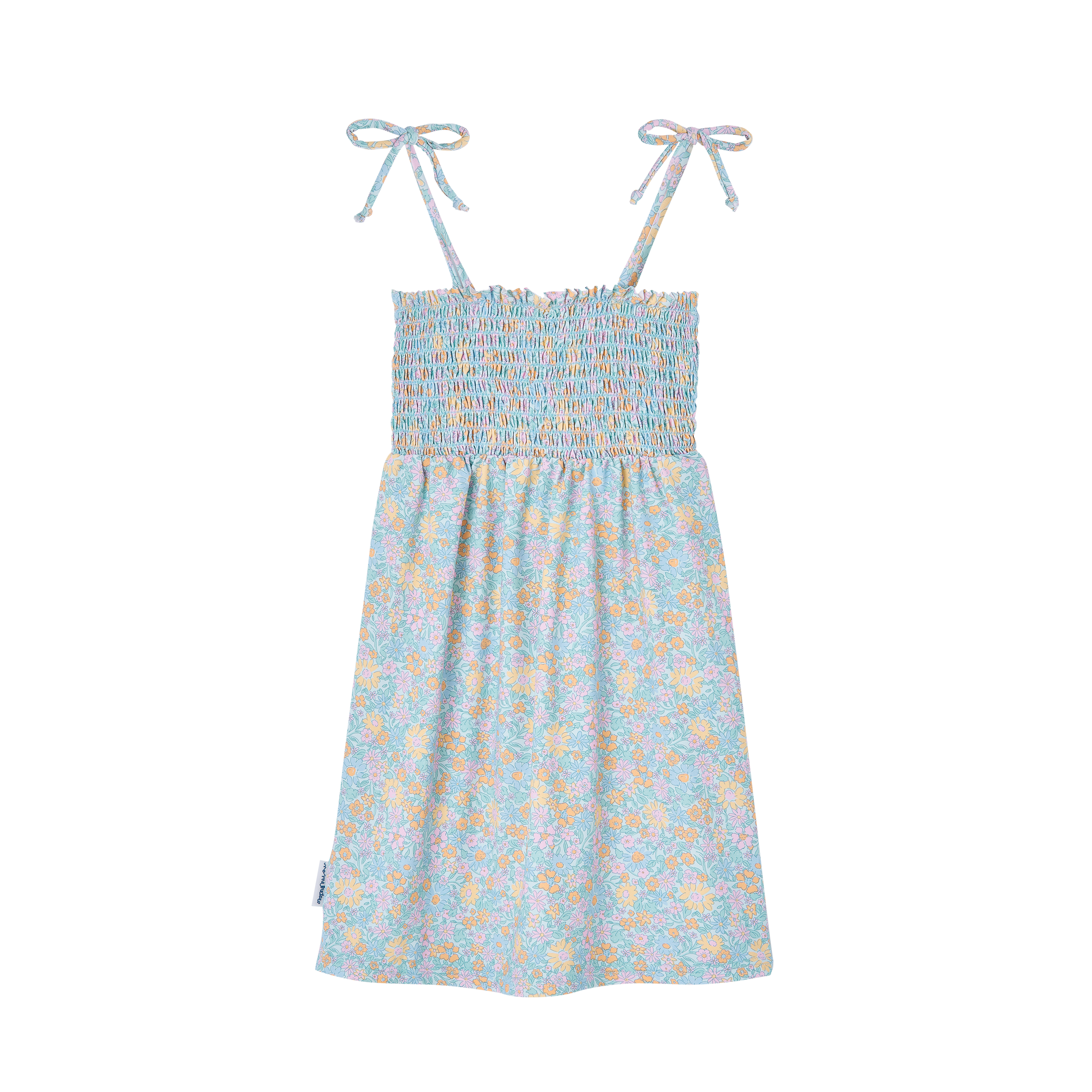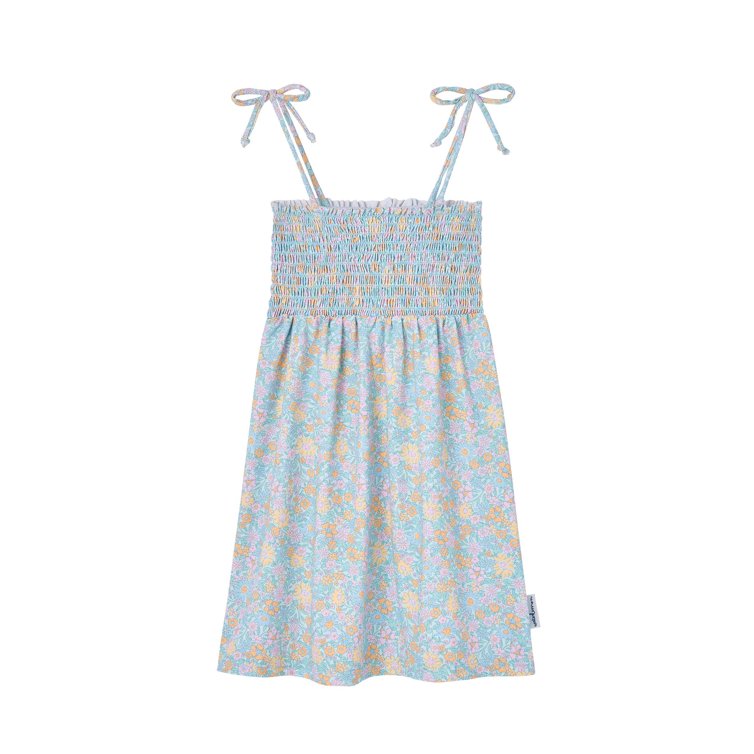 VESTIDO ESCOTE TIPO BANDA CON DETALLE NIDO DE ABEJA Y LAZADA EN LOS TIRANTES.
