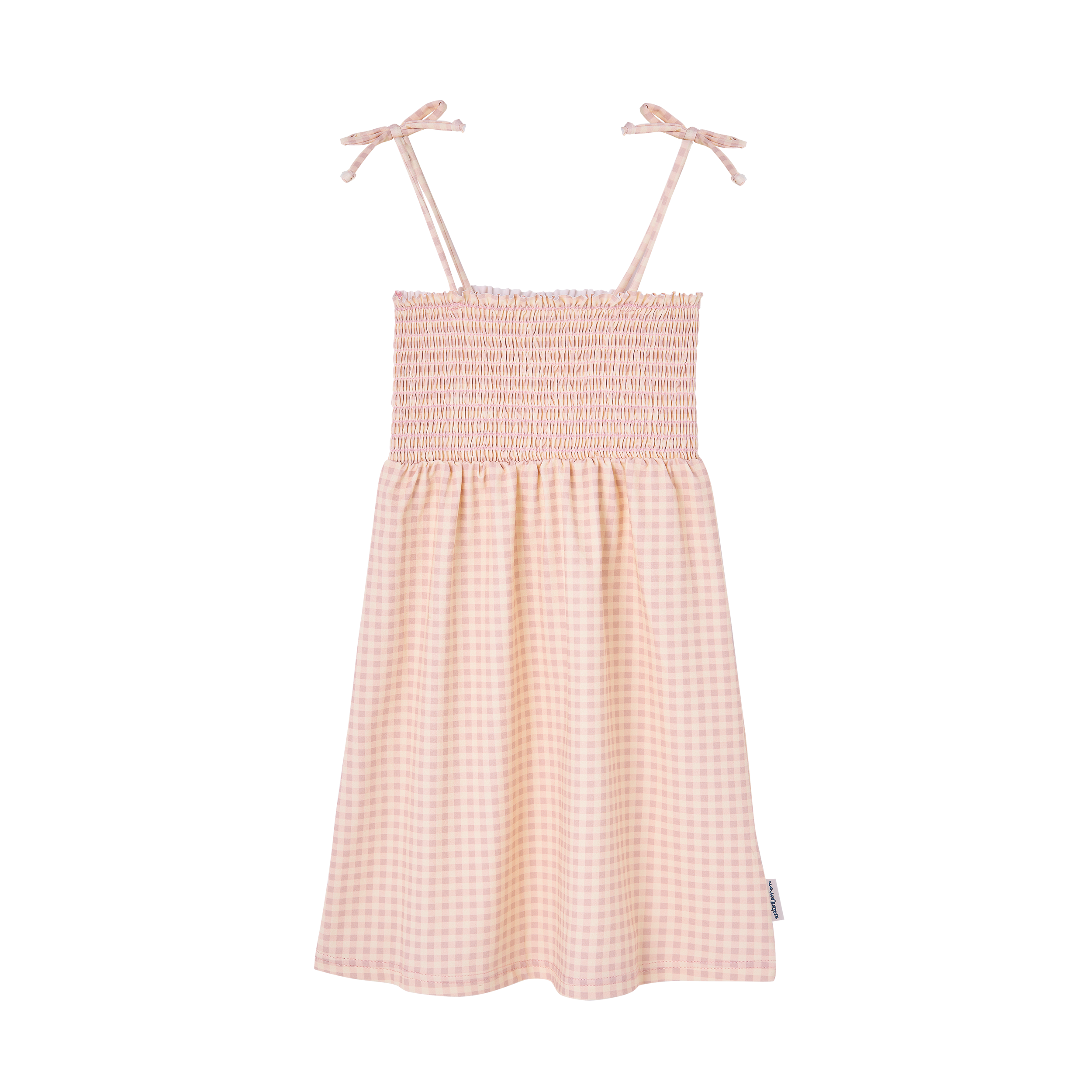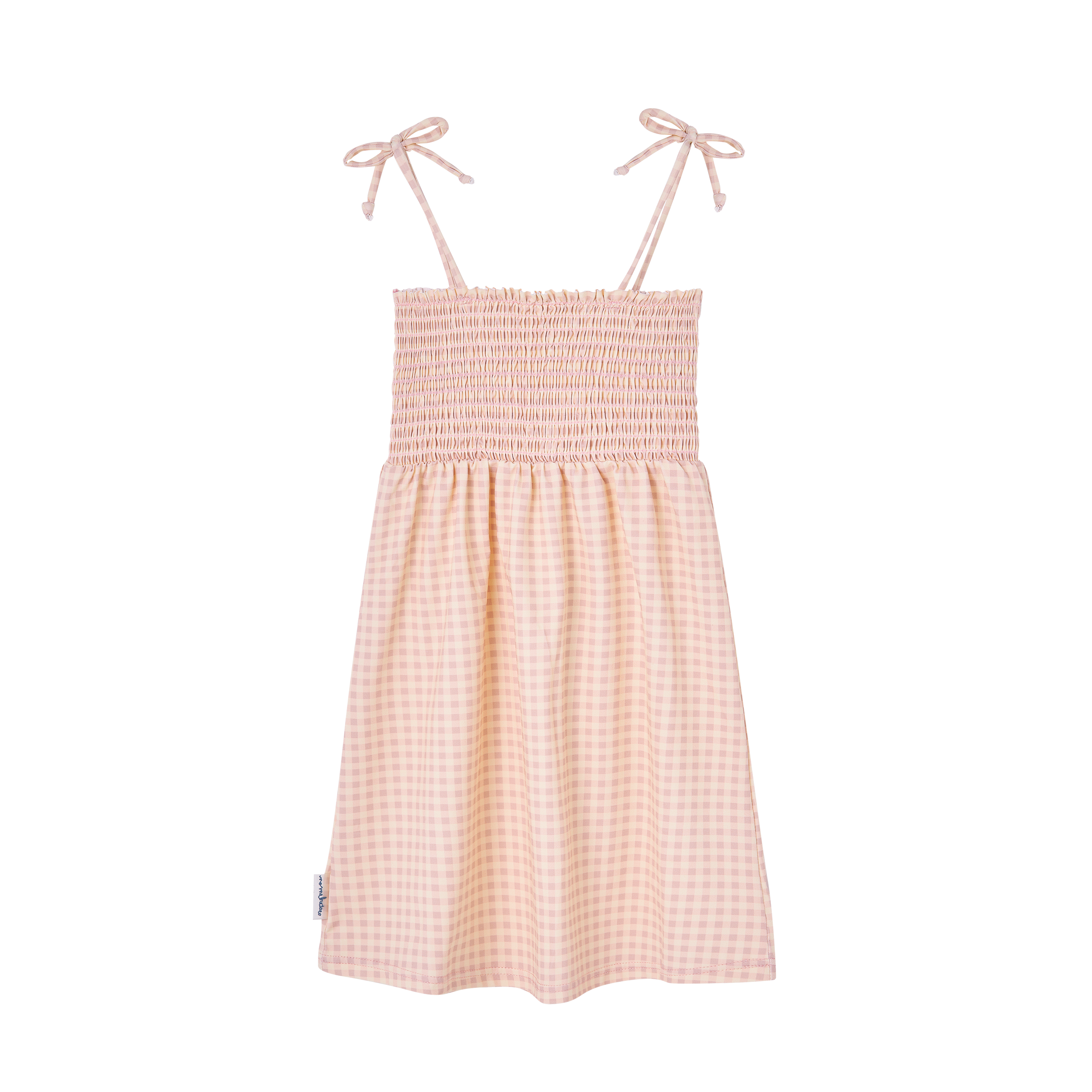 VESTIDO ESCOTE TIPO BANDA CON DETALLE NIDO DE ABEJA Y LAZADA EN LOS TIRANTES.
